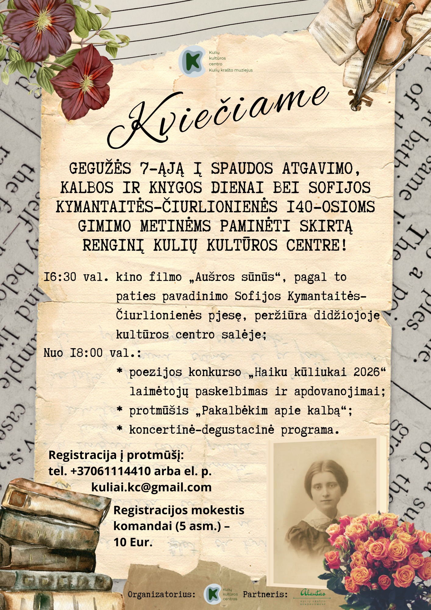 Gegužės 7-ąją kviečiame įdomiai praleisti vakarą #Kuliuose – klausantis Sofijos Kymantaitės-Čiurlionienės gyvenimo įkvėptų trumpučių haiku eilėraščių, kamerinės muzikos, pasakojimų apie žymiuosius „Sofijos šeštadienius“, o svarbiausia – dalyvaujant nuotaikingame ir azartiškame protmūšyje! Vakarui ypatingo skonio suteiks Kulių krašto bendruomenė Alantas degustacinė programa. Tad būtinai ateikite – laukiame visų!